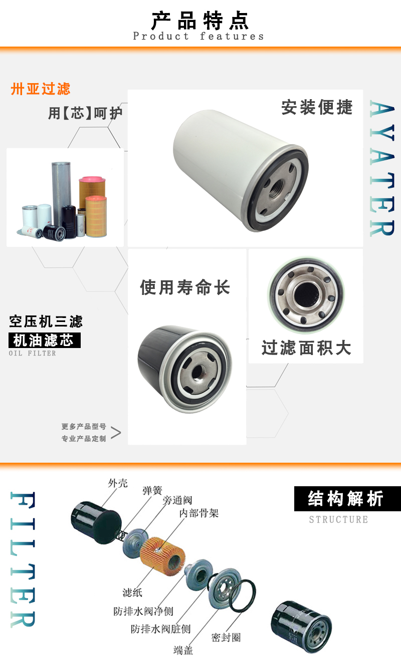 42843805 空壓機(jī)機(jī)油過濾器的功能是將主機(jī)產(chǎn)生的含油壓縮空氣進(jìn)入冷卻器,經(jīng)機(jī)械分離進(jìn)入油氣濾芯進(jìn)行過濾,對氣體中的油霧進(jìn)行攔截和聚合,形成油滴集中在濾芯底部經(jīng)回油管返回到壓縮機(jī)潤滑系統(tǒng),使壓縮機(jī)排出純凈的壓縮空氣;簡單說就是除去壓縮空氣中的固態(tài)塵埃、油氣粒子和液態(tài)物質(zhì)的裝置。